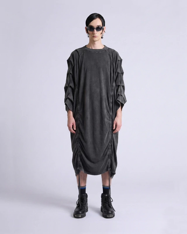 Tiene un calce estilo oversize, con hombros caidos y cuello medio.