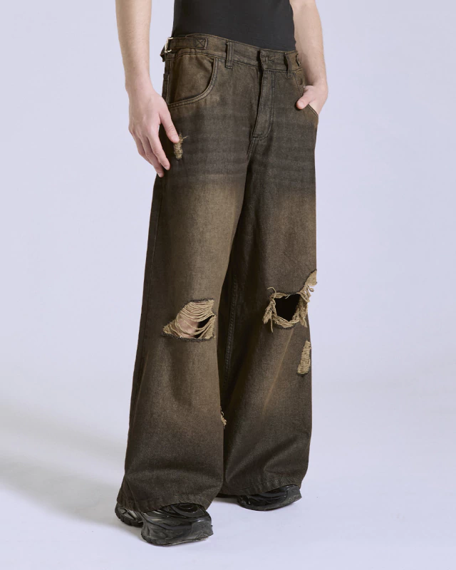 El proceso de lavado con teñido óxido y desgaste genera roturas intencionales, logrando un acabado premium y una sensación cómoda al usarlo.